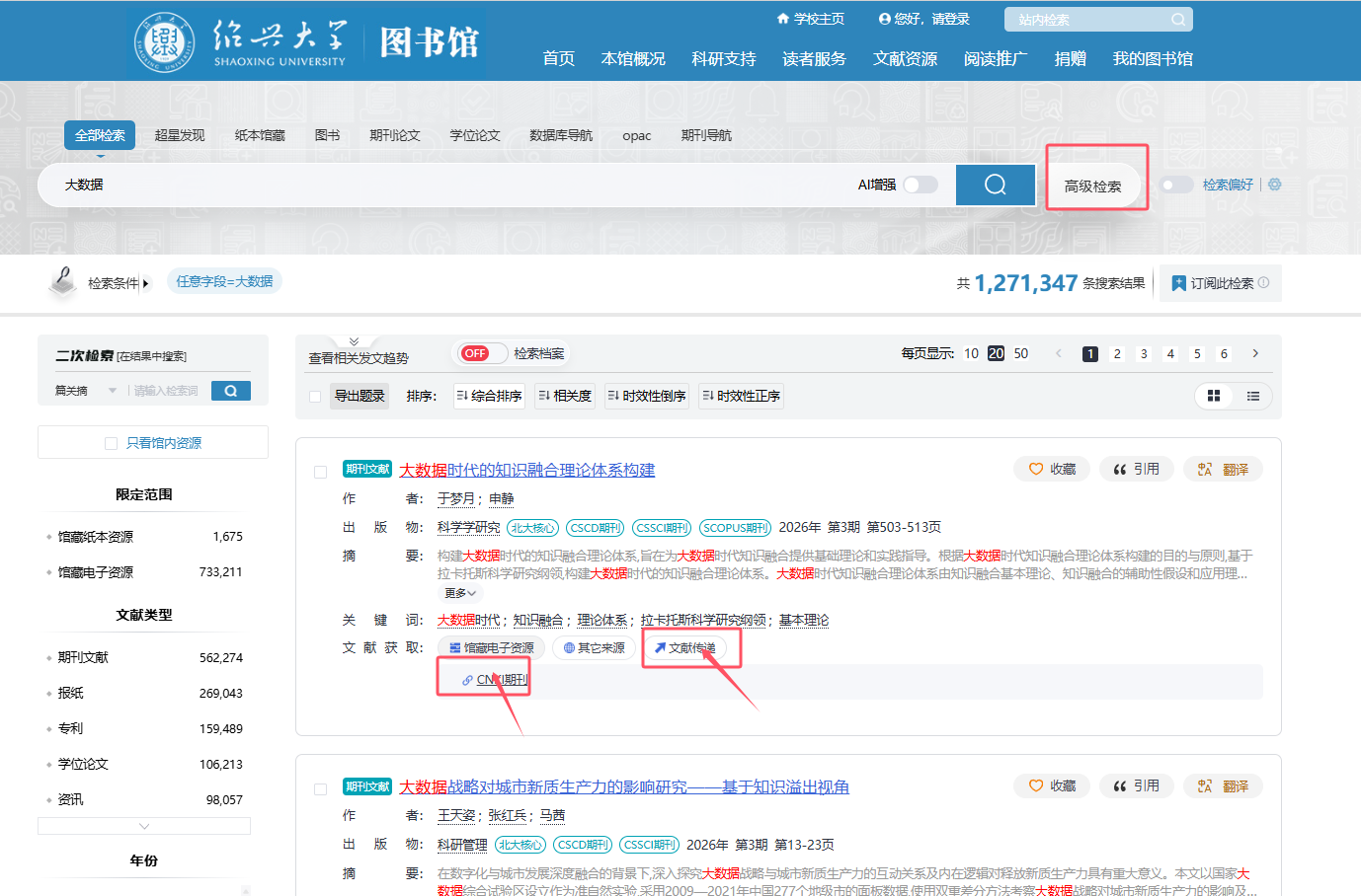(2)在检索结果页面中,可以选择相应的数据库获取资源,本校未购买的全文资源可以通过文献传递的方式获取(如下图所示)。