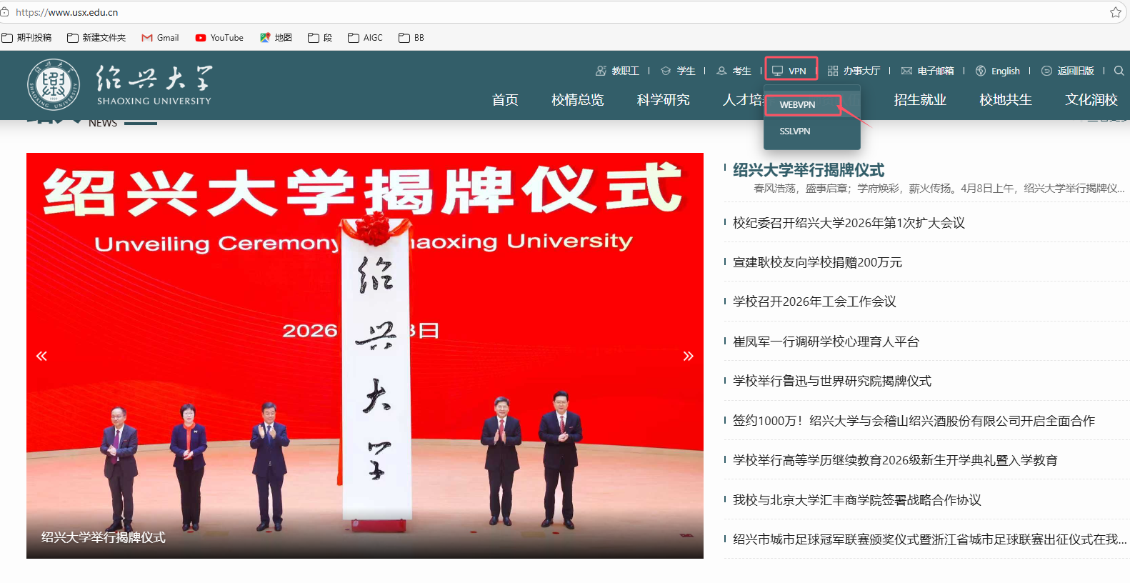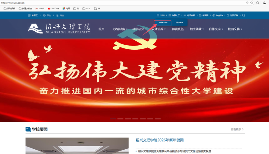 1.打开学校官网首页https://www.usx.edu.cn/,点击“VPN->WEBVPN”,企业微信扫码登录。