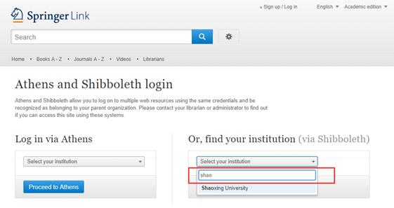 (3) 在“find your institution”搜索框中输入“Shaoxing University”;点击搜索结果,跳转至“绍兴文理学院统一身份认证”,身份认证通过后即可访问数据库。