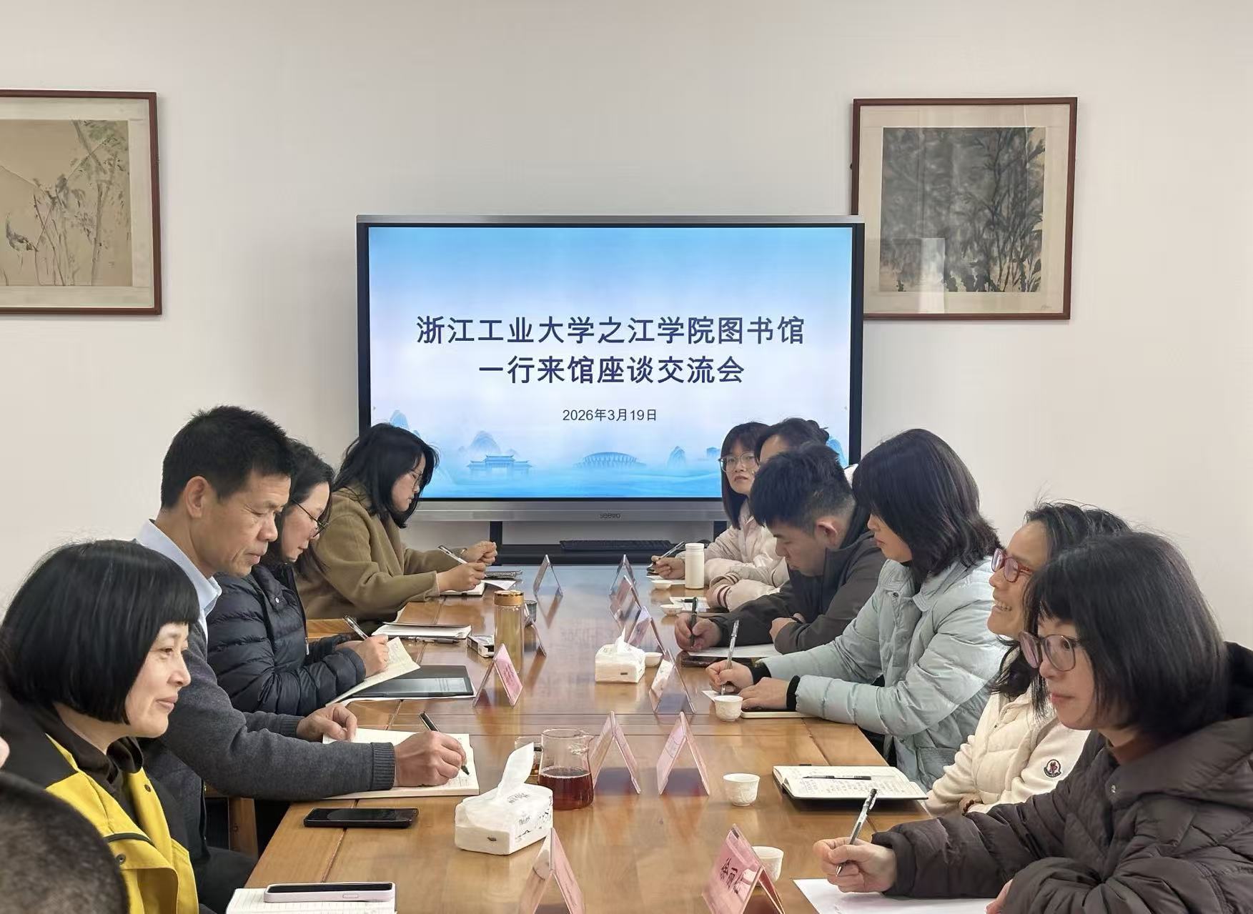 3 月 19 日上午,浙江工业大学之江学院图书馆周群芳馆长一行莅临我馆考察交流。我馆李秀明馆长携各部室负责人,与到访同仁在图书馆三楼会议室举行座谈。