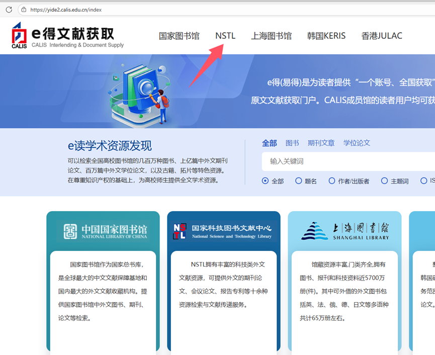 3. 如需代查 NSTL 馆藏外的资源或 NSTL 馆藏的标准类资源,请直接到 NSTL的文献传递系统(https://www.nstl.gov.cn/)提交申请;